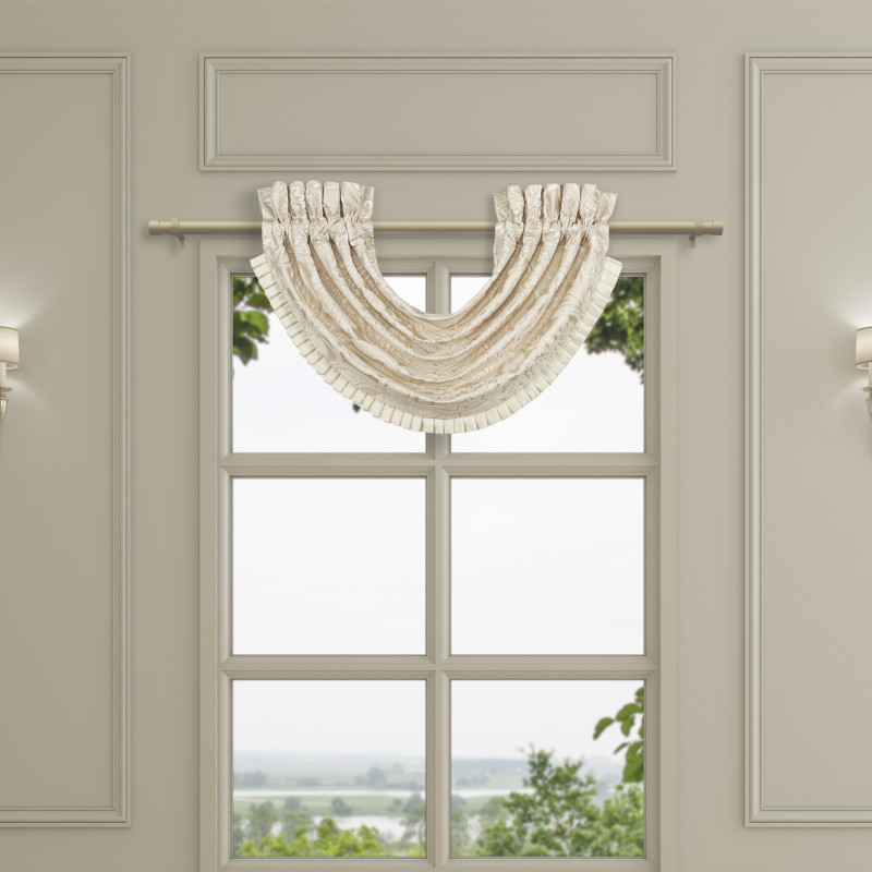 Create a tailored, luxurious look on your windows with the Villanova Waterfall Valance, crafted from a woven jacobean design in soft champagne tones. Fully lined for a polished finish, this valance is accented with a pleated flange for an added decorator’s touch.