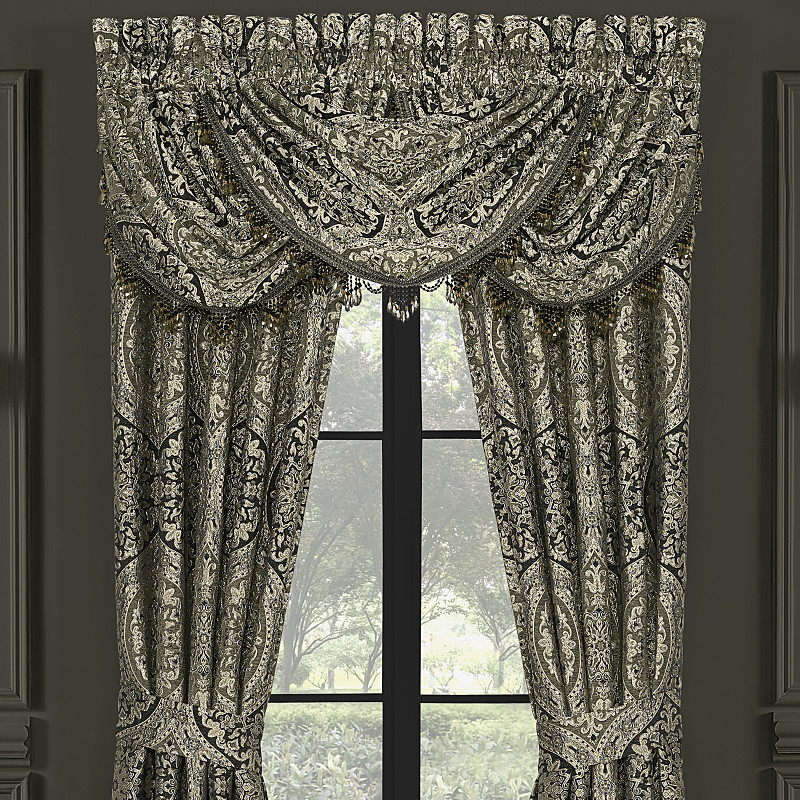 The Terra Waterfall Window Valance is a luxurious accent for your bedroom, crafted from woven jacquard medallion fabric in olive green and black tones with a soft chenille finish. Sparkling crystal tassel fringe adds a refined, elegant touch to this grand design.