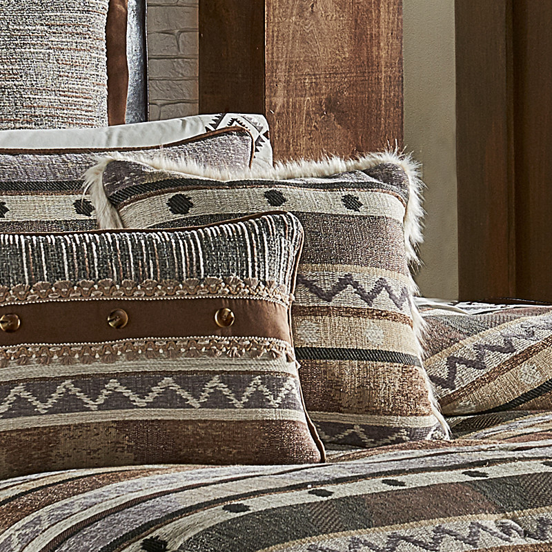 The Timber 18″ Decorative Pillow is a chic accent for your bedding ensemble. It features a textured jacquard zig-zag border paired with faux suede and finished with a button detail, adding dimension, style, and sophistication to your bedroom décor.
